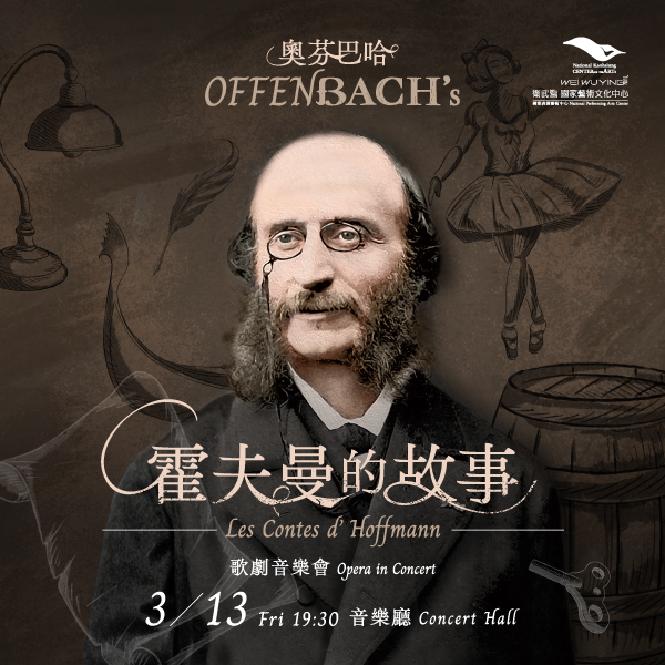 2026年3月,衛武營搬演《霍夫曼的故事》歌劇音樂會,帶領觀眾探索19世紀德國最知名作家E.T.A.霍夫曼與法國最知名歌劇作曲家奧芬巴哈的跨時空交會,三段充滿著奇思妙想的戀愛回憶,搭配高潮迭起的動聽旋律,交疊出音樂史上最超脫時代的幻想故事,堪稱是19世紀歌劇版《黑鏡》!